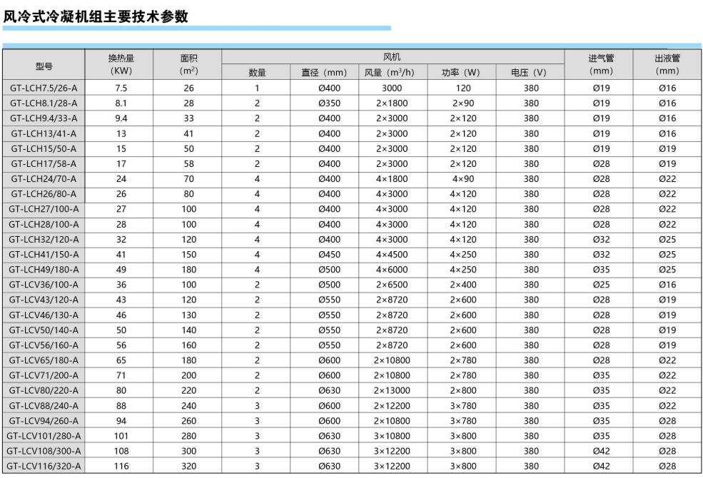国特品牌风冷式冷凝机组是配套于冷冻设备用的利用空气进行冷却的散热设备,主要有侧吹风和顶吹风两种形式,风冷式冷凝机组可与 不同制冷量的冷风机、排管等末端设备配套,用于不同库温的冷库中。